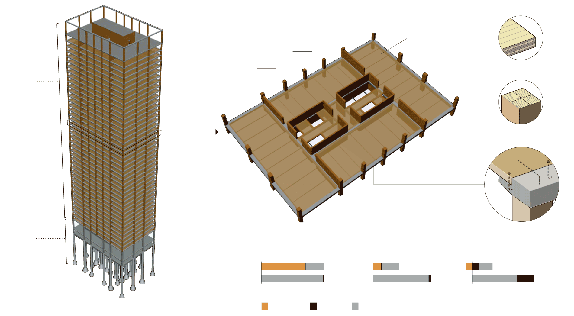 The Skidmore, Owings & Merrill system uses a type of engineered wood called glued laminated timber, or glulam, for the building columns, and cross-laminated timber slabs for the central core, floors and shear walls, which provide stiffness against wind loads. But the concept calls for concrete beams along the perimeter of each floor and elsewhere to allow for longer spans and thus more flexibility in floor layouts.