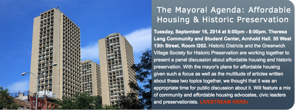 September 12, 2014 Affordable Housing + Historic Preservation Sept 16 2014 – NYC The Center for New York City Affairs, Historic Districts Council, and the Greenwich Village Society for Historic Preservation are working together to present a panel discussion about affordable housing and historic preservation. With the mayor’s plans for affordable housing given such a focus as well as the multitude of articles written about these two topics together, we thought that it was an appropriate time for public discussion about it. This program will feature a mix of community and affordable housing advocates, civic leaders and preservationists. http://events.newschool.edu/event/the_mayoral_agenda_affordable_housing_and_historic_preservation#.VBMdKeckum0 Share this: Click to share on X (Opens in new window) X Click to share on Facebook (Opens in new window) Facebook Like Loading... Related